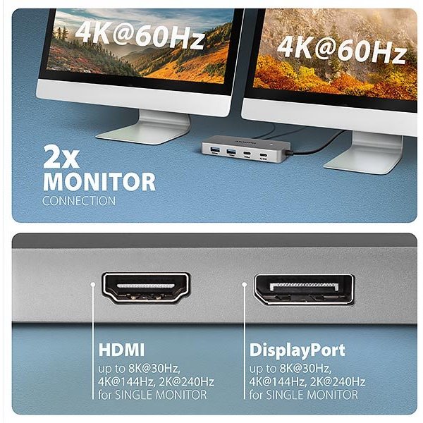 Dokovací stanice nabízí dva video výstupy – HDMI a DisplayPort umožňují připojení externích monitorů, televizorů nebo projektorů s rozlišením až 8K/30Hz Ultra HD. Podporována jsou také další rozlišení, například 4K/144Hz Ultra HD, 2K/240Hz Quad HD nebo 1080p/240Hz Full HD a přenos vícekanálového zvuku přes HDMI. Při současném zapojení dvou monitorů poskytuje rozlišení 4K/60Hz na každém z nich. Díky podpoře HDR (High Dynamic Range) si uživatelé mohou vychutnat výrazně širší rozsah barev a vyšší kontrast, což ocení při práci i zábavě.