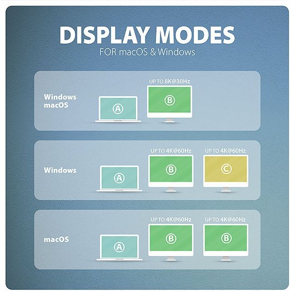 • Pro dosažení maximálních hodnot rozlišení a frekvencí na video výstupech je nutné hub zapojit do USB-C portu s podporou DisplayPort Alternate Mode (DP Alt Mode) verze min. 1.4 nebo do USB-C portu s podporou min. Thunderbolt 3. Dále je nutný vhodný aktualizovaný OS a aktuální grafické ovladače.