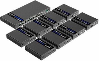 Extender se skládá z jedné vysílací jednotky s lokálním výstupem HDMI a osm přijímačů, které se propojí CAT6/6a/7 kabelem s vysílačem.
