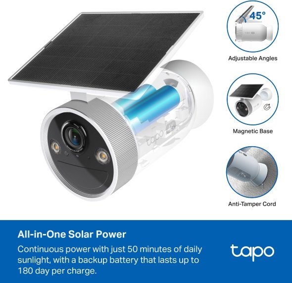 Vychutnejte si dokonale ostrý 4K obraz, dlouhou výdrž na baterii a celodenní provoz pomocí vestavěného solárního panelu. Tapo C465 vám díky AI detekci, dvoupásmové Wi-Fi a odolnosti IP65 zajistí spolehlivé zabezpečení kdekoliv na pozemku – bez kabelů a bez kompromisů.