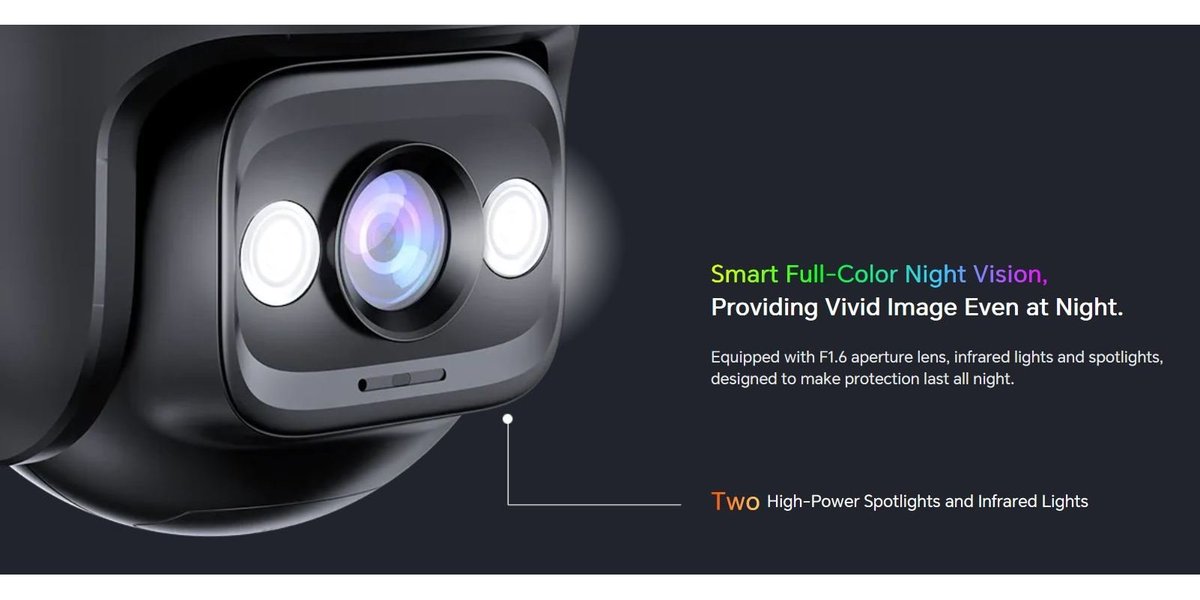 Venkovní otočná IP kamera s rozlišením 3 MPx (2304 x 1296px) a přenosem zvuku, úhel záběru 355° horizontálně a 90° vertikálně, noční vidění s dosvitem 30 m, detekce pohybu, osoby a vozidla, automatické otáčení za pohybem, vestavěný mikrofon, vestavěný reproduktor a siréna, cloud platforma, slot pro microSD kartu max. 512 GB, krytí IP65, připojení pomocí WiFi 6 nebo Ethernet portu RJ45, aplikace pro Android a iOS v češtině. Podporuje Amazon Alexa, kódování H.265, ONVIF.