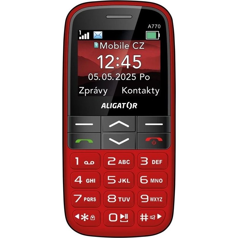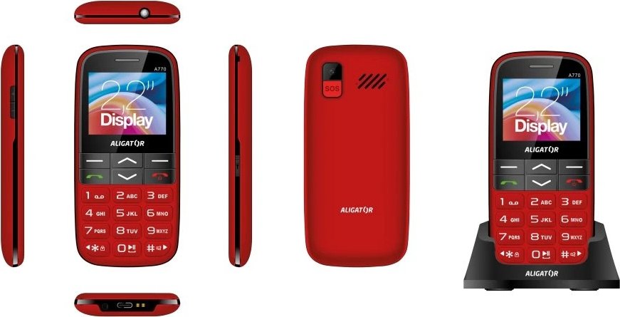Obsah balení: Telefon Aligator A770, nabíjecí stojánek, návod k použití (bez nabíječky)