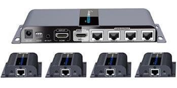 Extender se skládá z jedné vysílací jednotky s lokálním výstupem HDMI a čtyř přijímačů, které se propojí CAT6/6a/7 kabelem s vysílačem.
