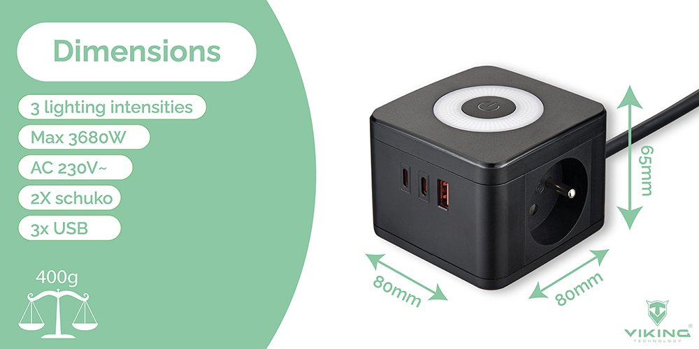 Síťový adaptér VIKING YC23L nabízí pohodlné a efektivní napájení vašich zařízení díky 2 AC výstupům a 3 USB portům, umožňujícím nabíjení až 5 zařízení současně. S dotykovým světlem se třemi intenzitami svícení a kompaktním designem je ideální pro domácnost i kancelář.