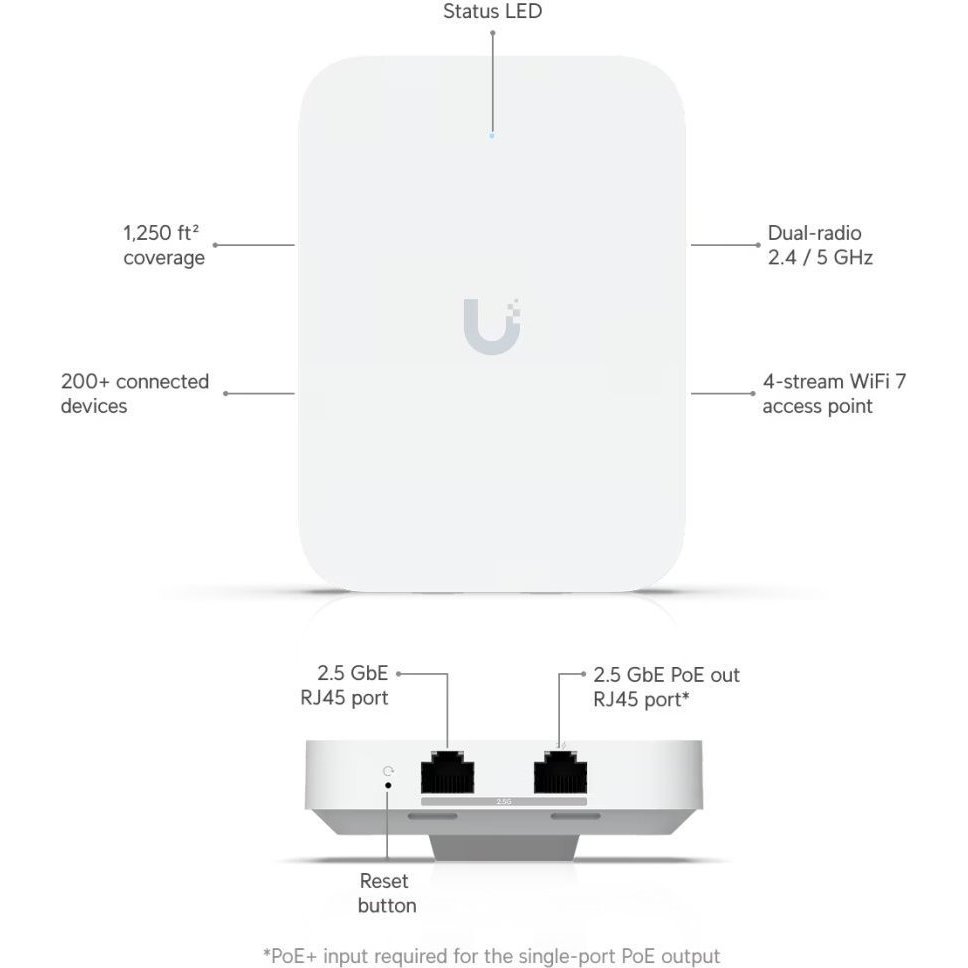 UniFi U7 In-Wall je designově povedené vnitřní hotspotové řešení využívající standard 802.11n/ac/ax/be. Je vybaveno anténním systémem MIMO 2×2 v podobě integrovaných antén se ziskem 4 dBi/ 8 dBi (2,4 GHz/ 5 GHz). Jednotka podporuje PoE/PoE+ napájení.